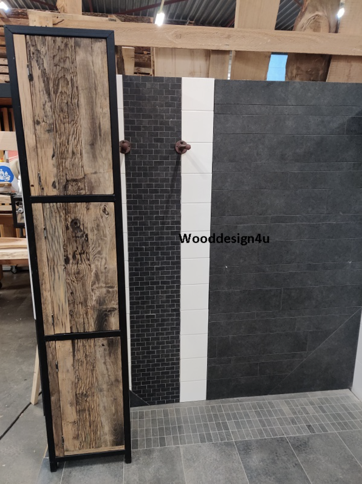 Oude eiken wagondelen met een zwart stalen frame en betonnen wasbak.