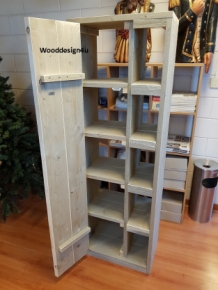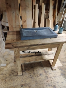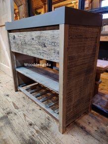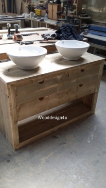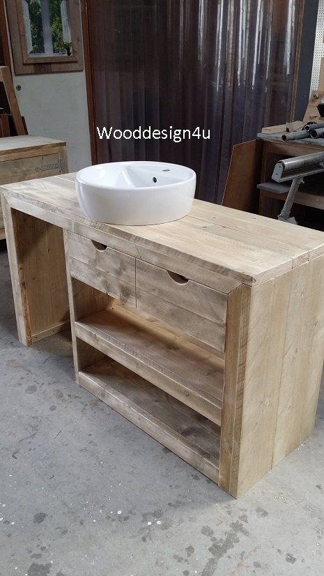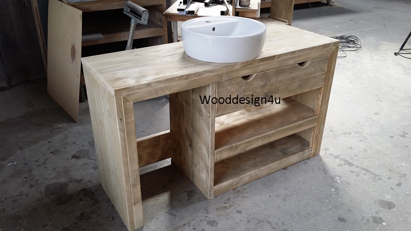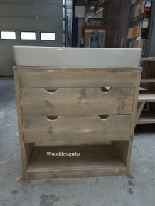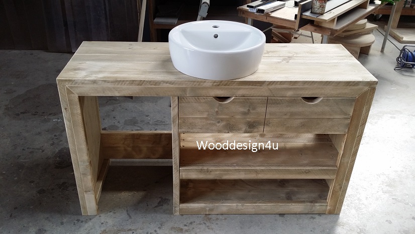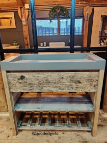 Wastafel Dionne van steigerhout met 2 legplanken en 1 lade verder is er ruimte voor een wasmand of u kunt hier extra schappen/legplanken nemen.