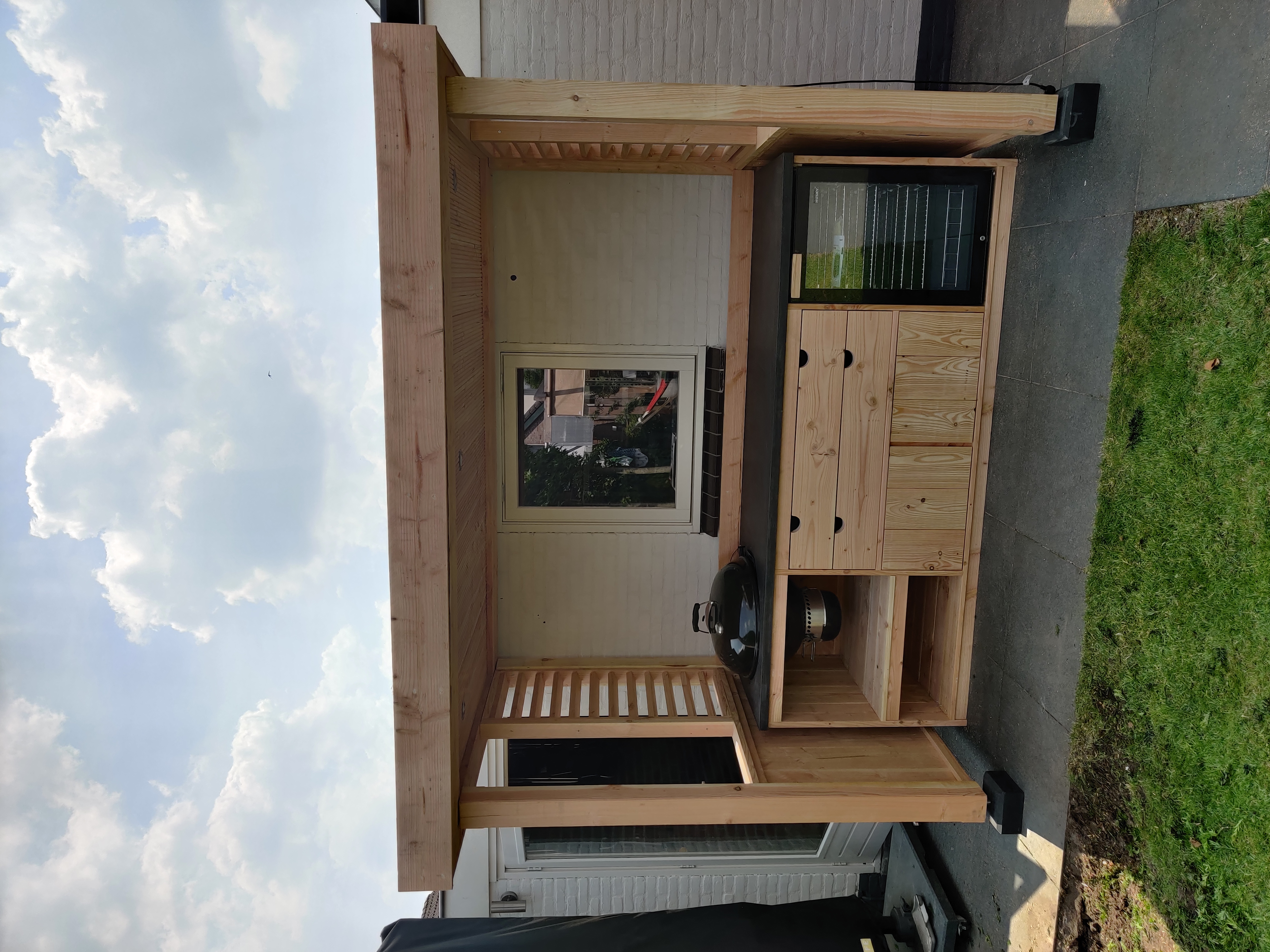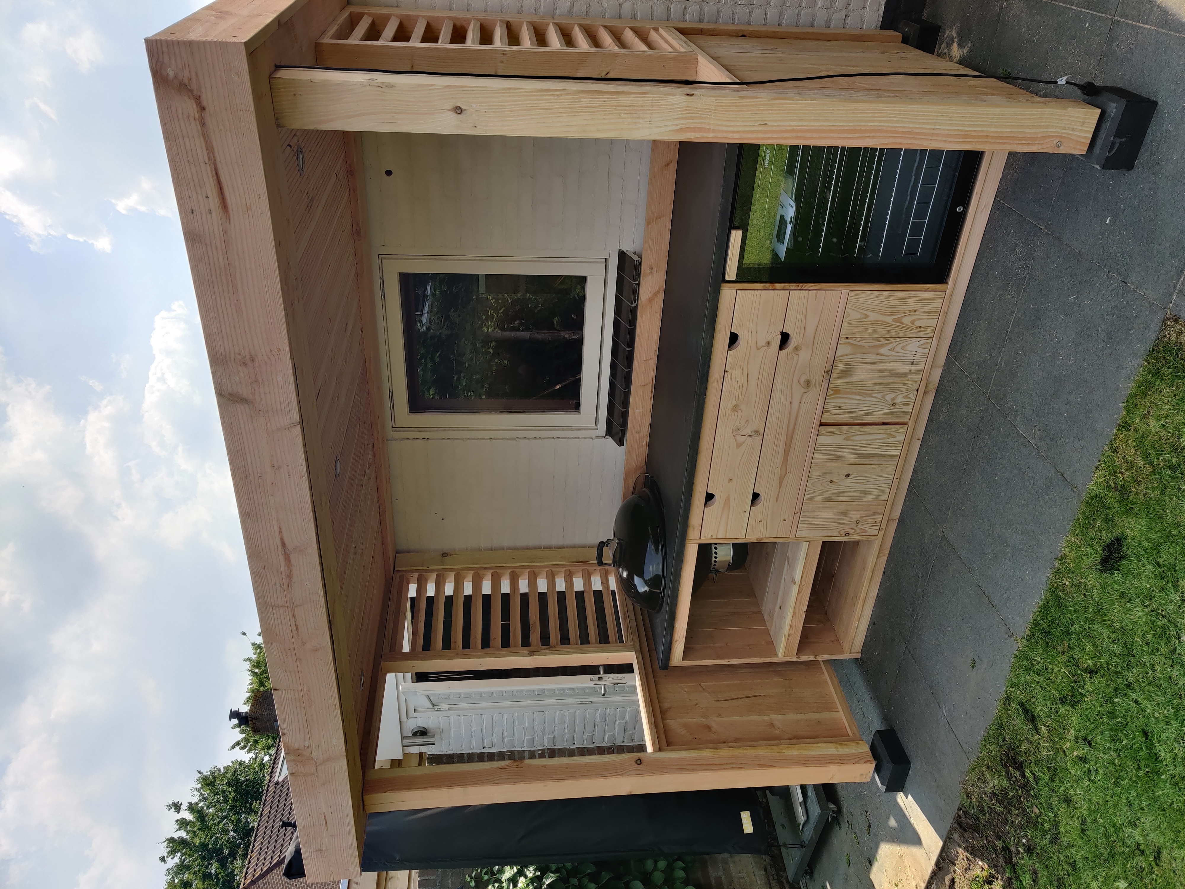 Buitenkeuken is ook van douglashout voorzien van deuren en lades, betonnen werkblad met uitsparing voor uw bbq apparatuur, laat ons weten wat voor apparatuur u heeft i.v.m. afmetingen.