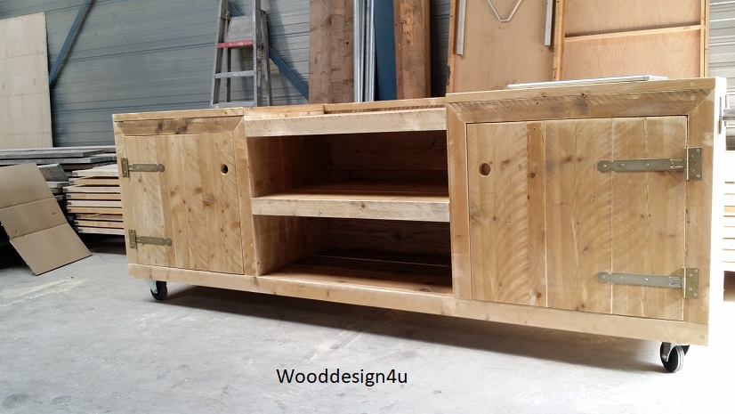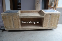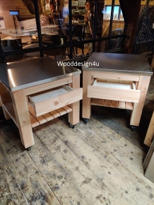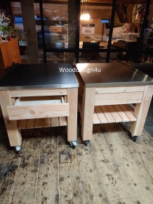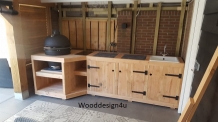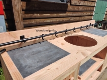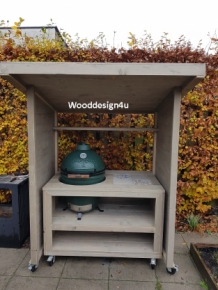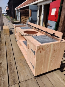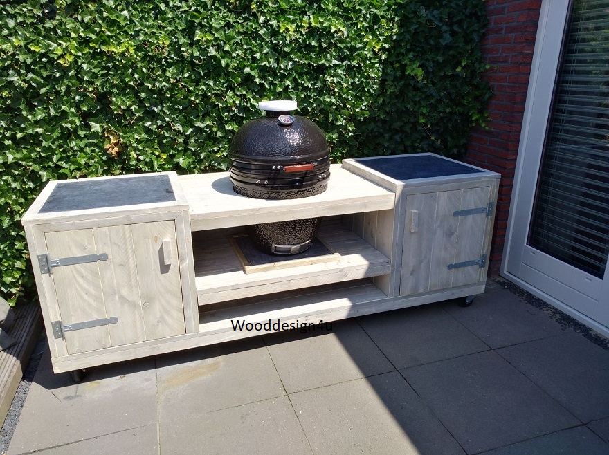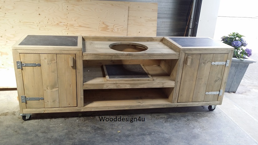 Grote buitenkeuken voor elke barbecue, het meubel is van geschuurd steigerhout en staat op wielen.