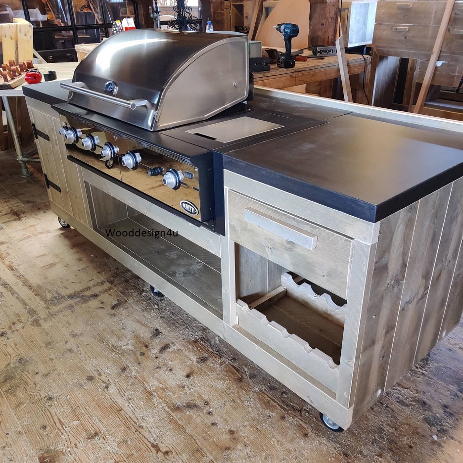 Stijlvolle buitenkeuken van steigerhout met beton.
