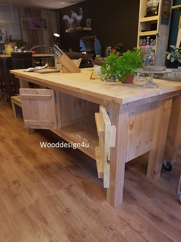 Douglas kook/barbecue buitenkeuken tafel van 3 cm dik douglashout en massieve poten van 9 x 9 cm.