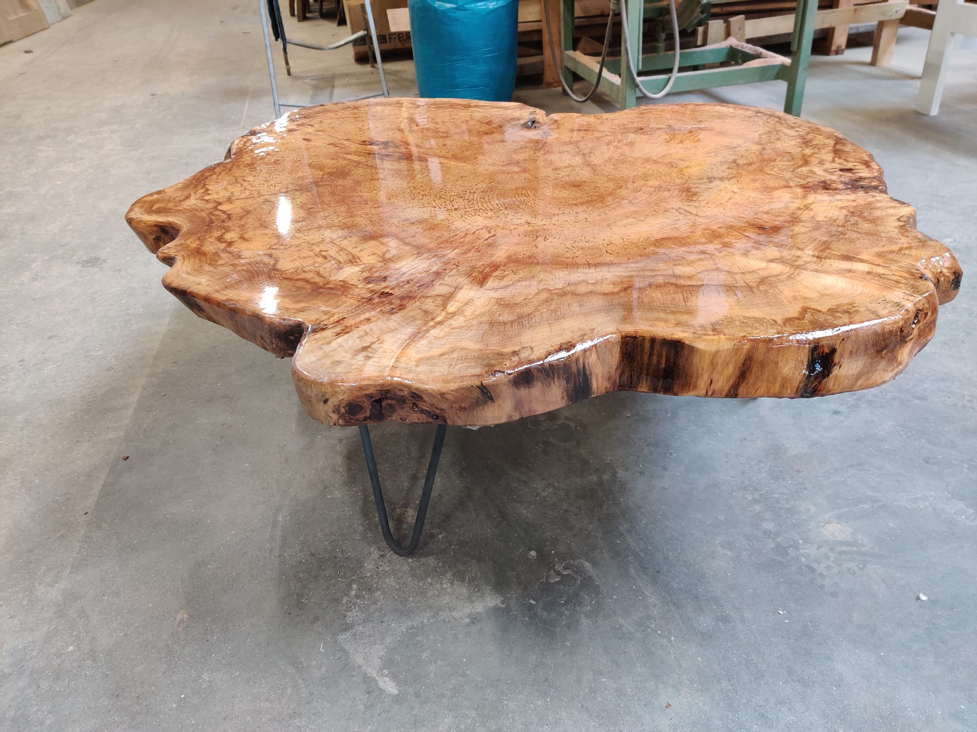 Salontafel van esdoom boomstamschif met prachtige tekening in epoxy.