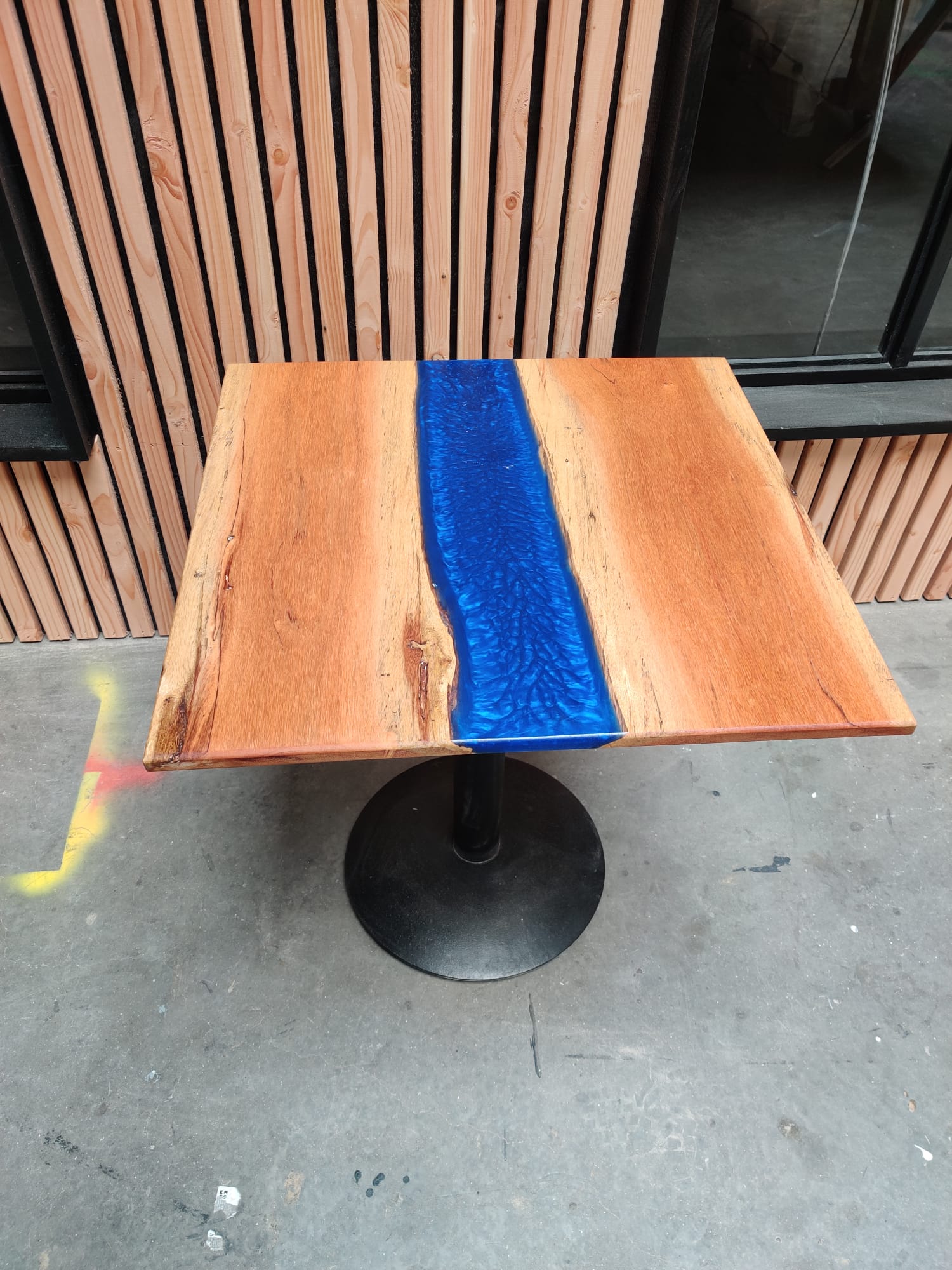 Tafelblad van hardhout met kobaltblauwe epoxy.