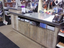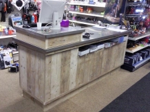 Toonbank en stelling van steigerhout in een bestaande slijterij gerestyled.
