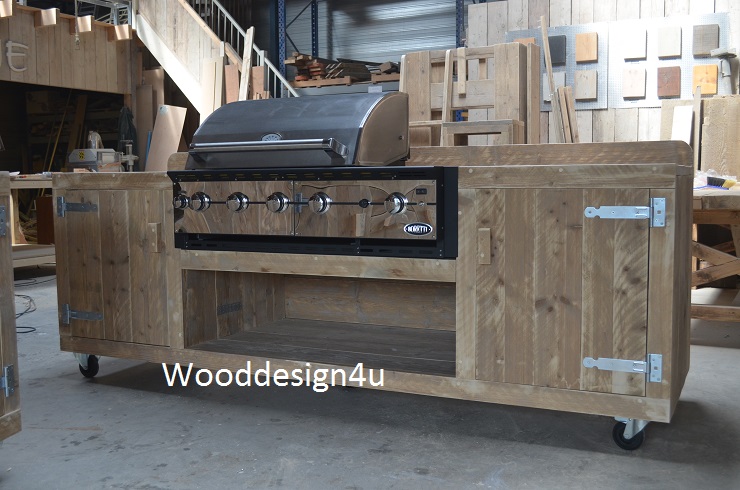 Deze keuken staat op wielen en is daardoor handig te plaatsen in uw tuin,overkapping etc.