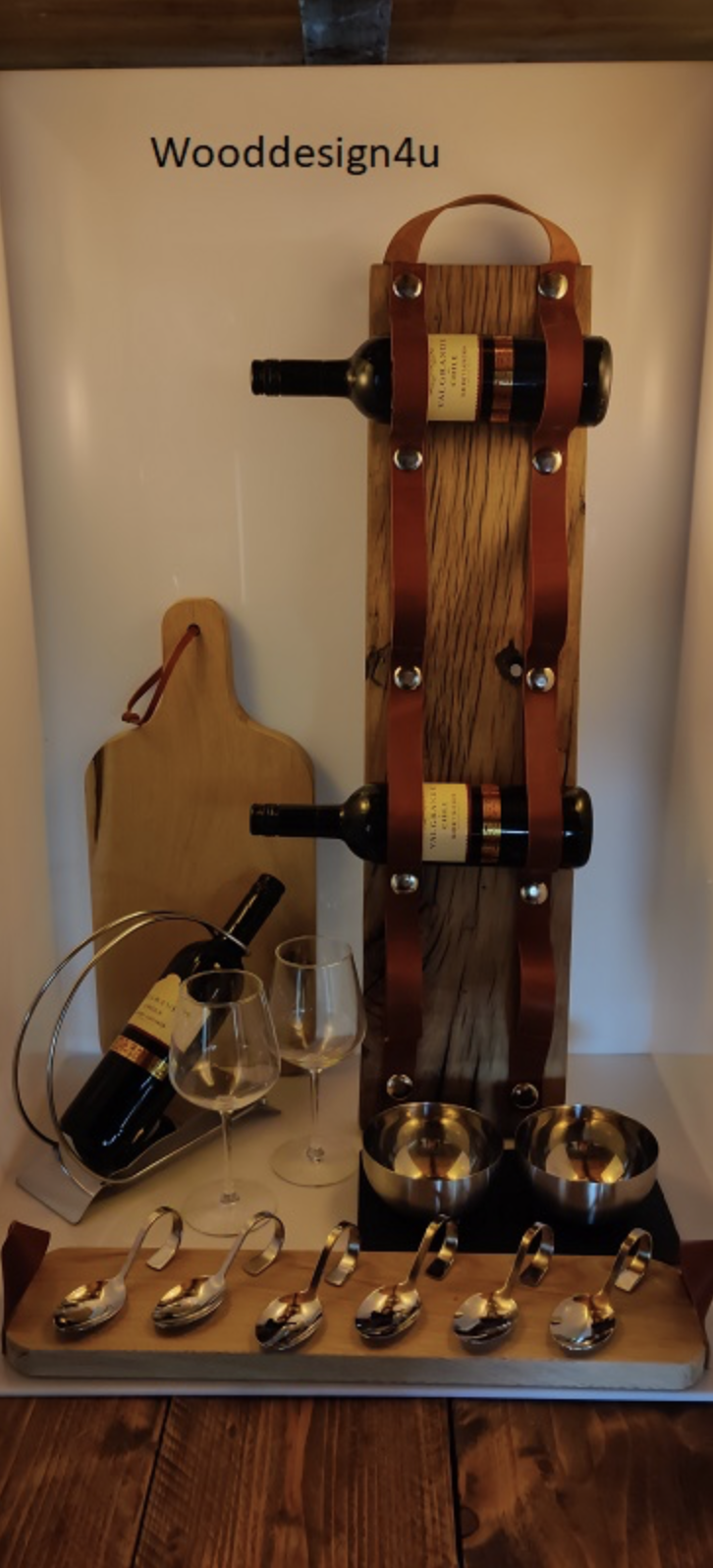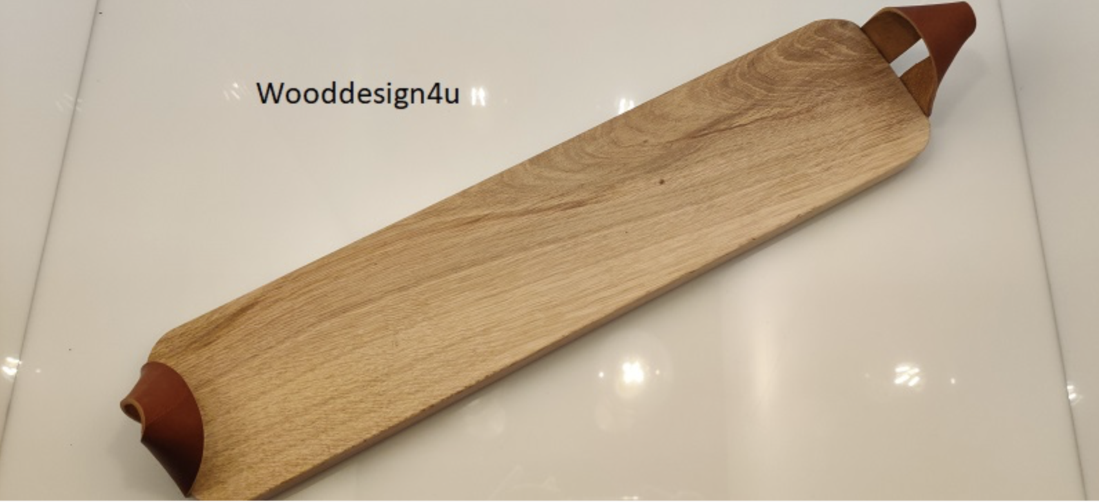 Amuseplank van rustiek eiken met leren handvaten.