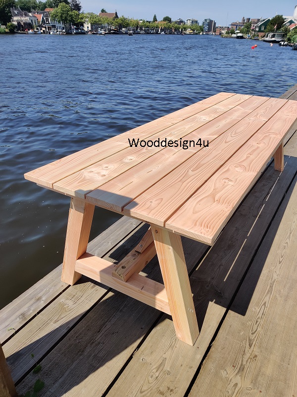 Robuuste douglashouten tafel met zwaar balken frame en een blad van geschaafd douglashout van 30 mm dik.