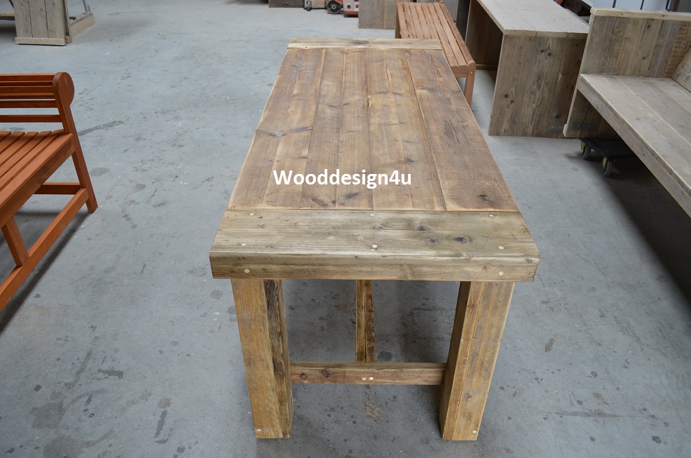 Mooie houten tafel met regelwerk en blokpoten in diverse maten leverbaar. Gemaakt van oude sloopdelen goed geschuurd en geborsteld.