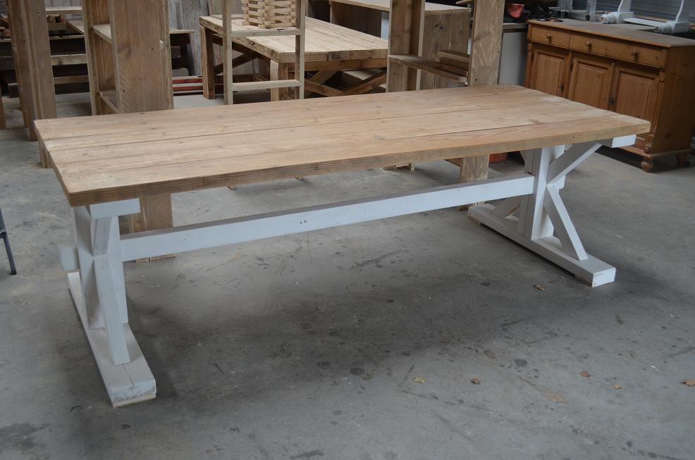 Stijlvolle kloostertafel met witte krijtverf onderstel van dikke oude balken en robuust sloophouten tafelblad, leverbaar in diverse maten.