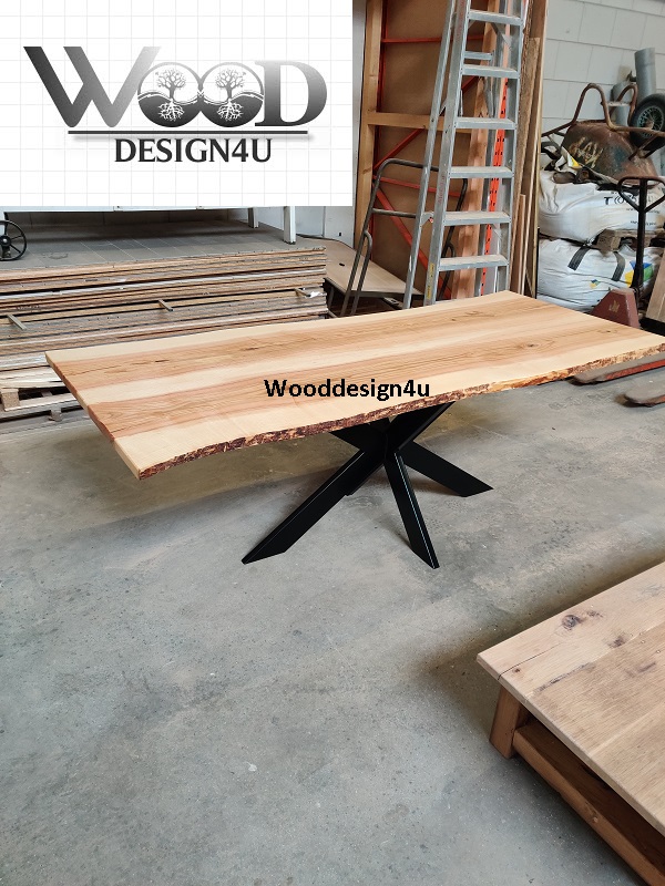 Olijfessen boomstamtafel op zwart stalen matrixpoot.