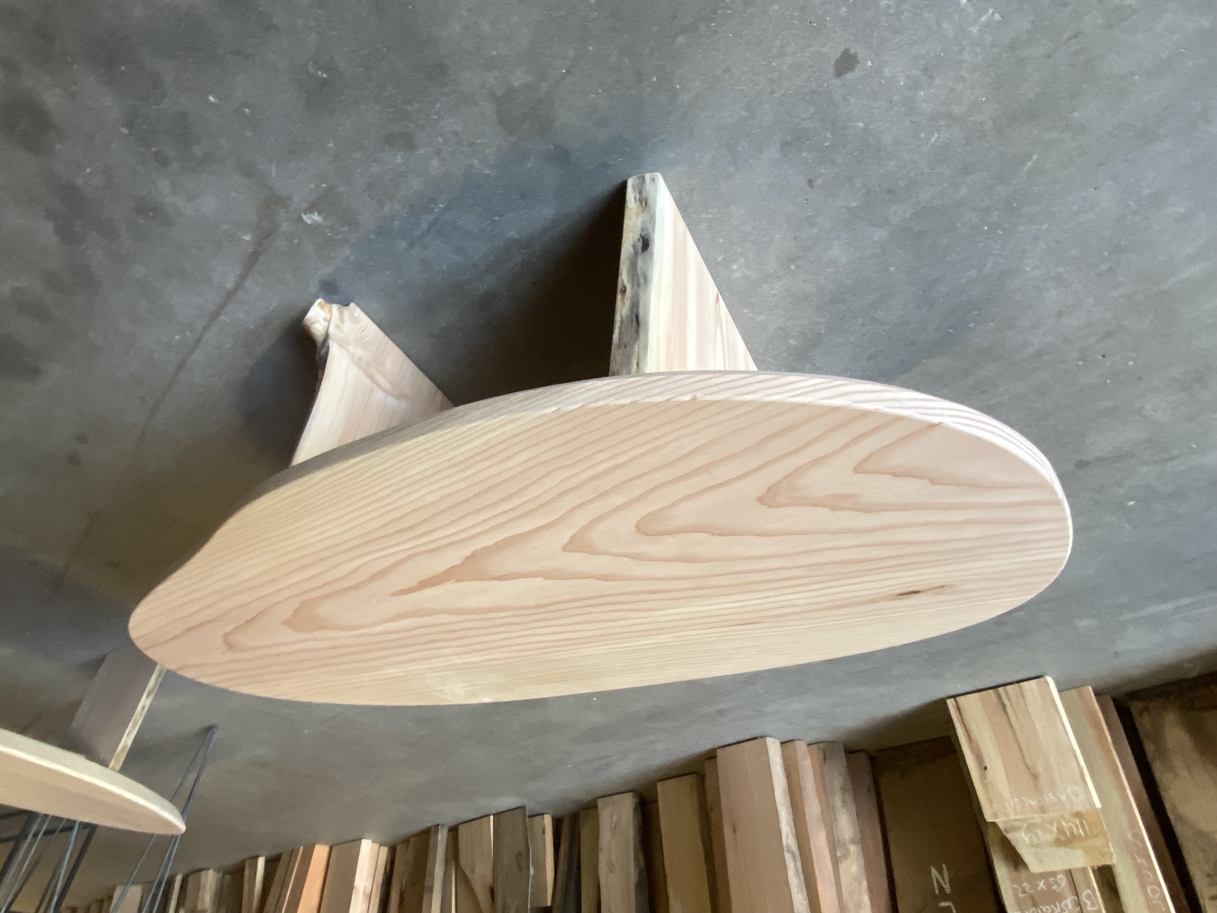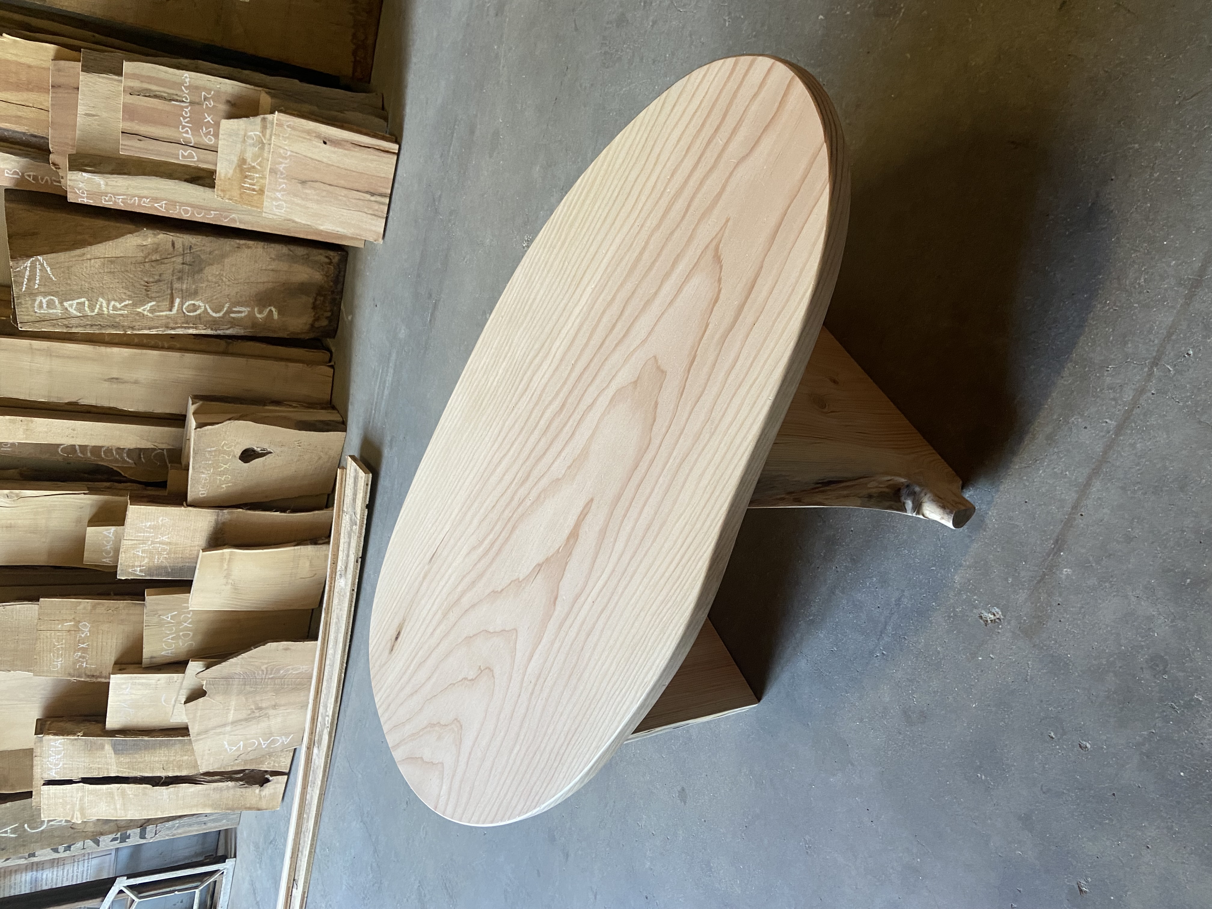 Kiezel vormige salon tafel van Douglas hout.