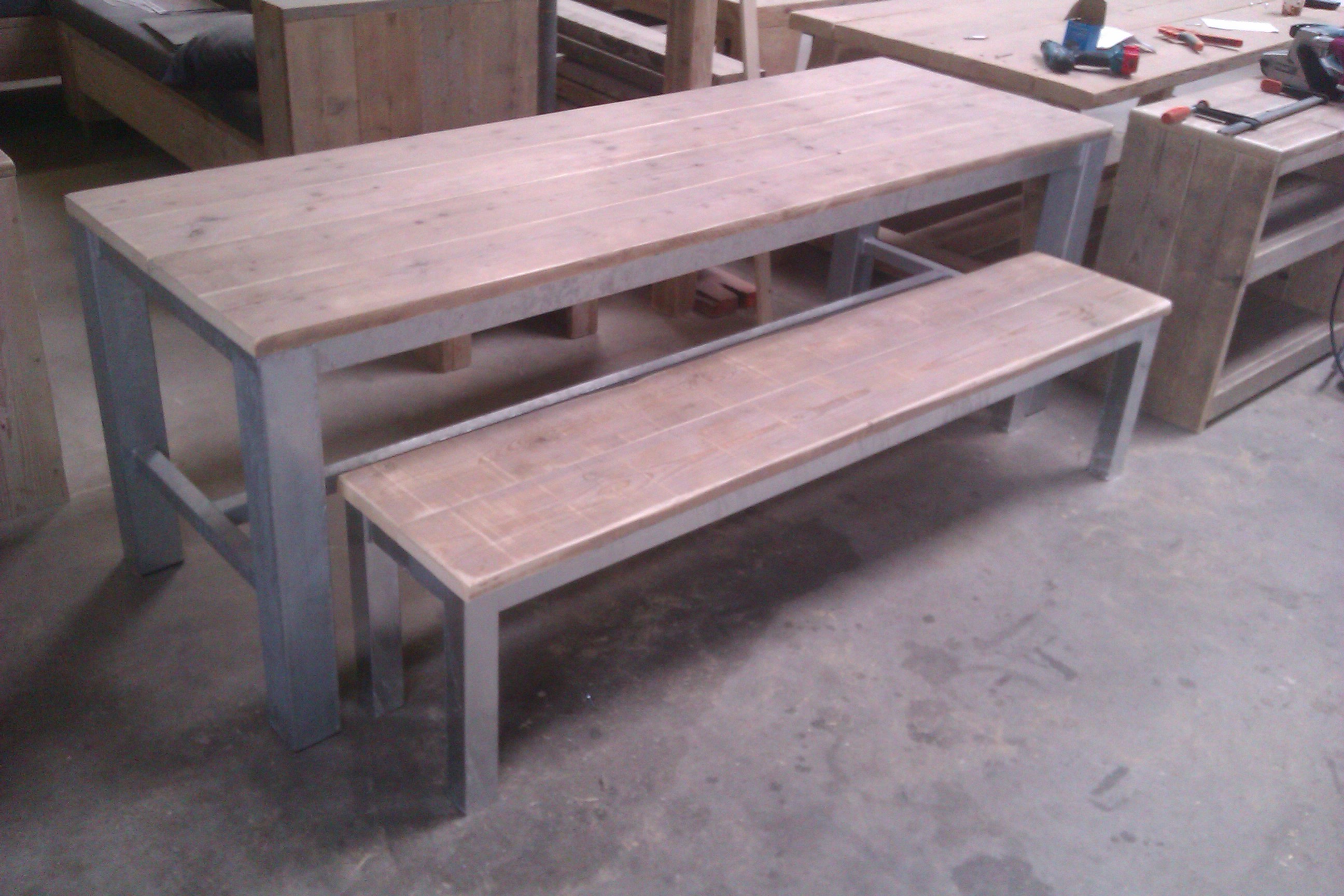Steigerhouten tafel met gegalvaniseerd onderstel een zeer solide tafel die een levenlang mee gaat.