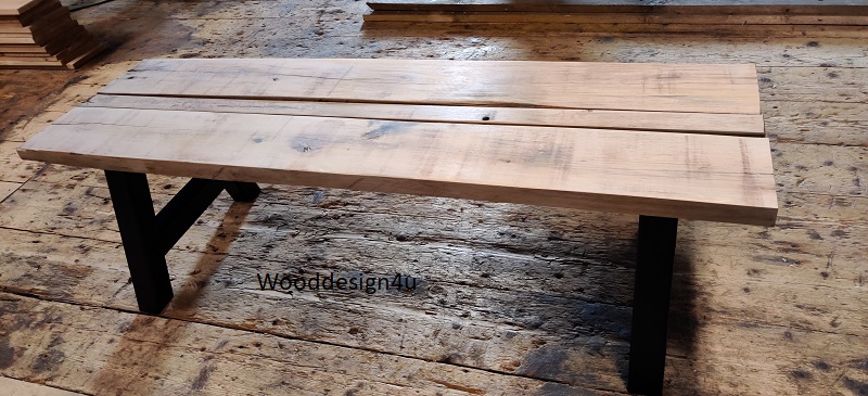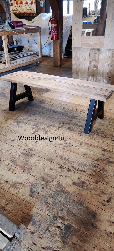 Bankje van oude eiken wagondelen op stalen gepoedercoated frame.