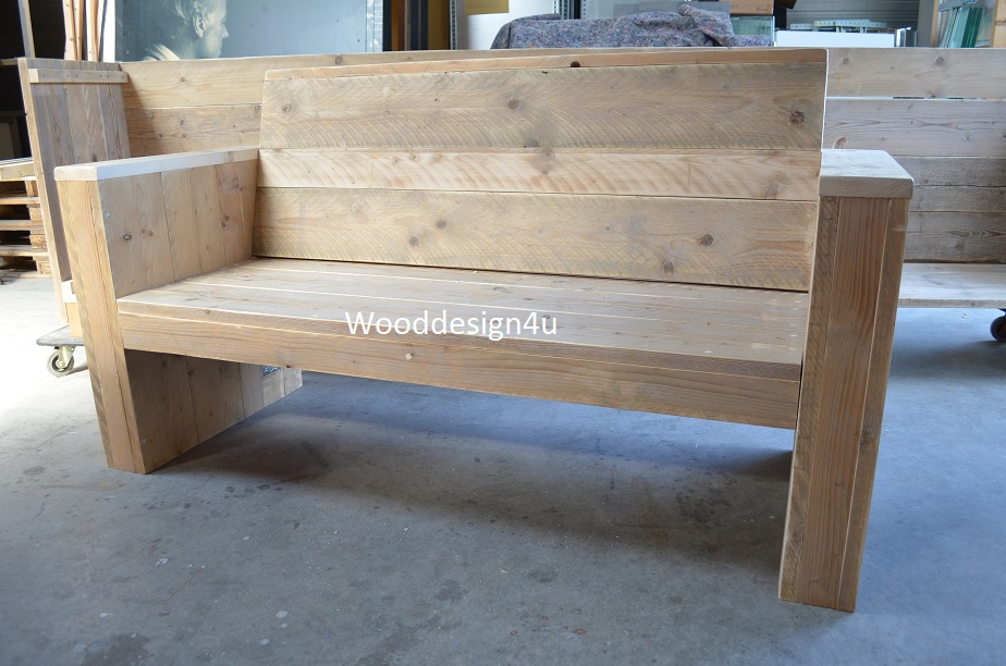 Stijlvolle steigerhouten tuinbank met dubbelwandige armleuningen en hoge rug.