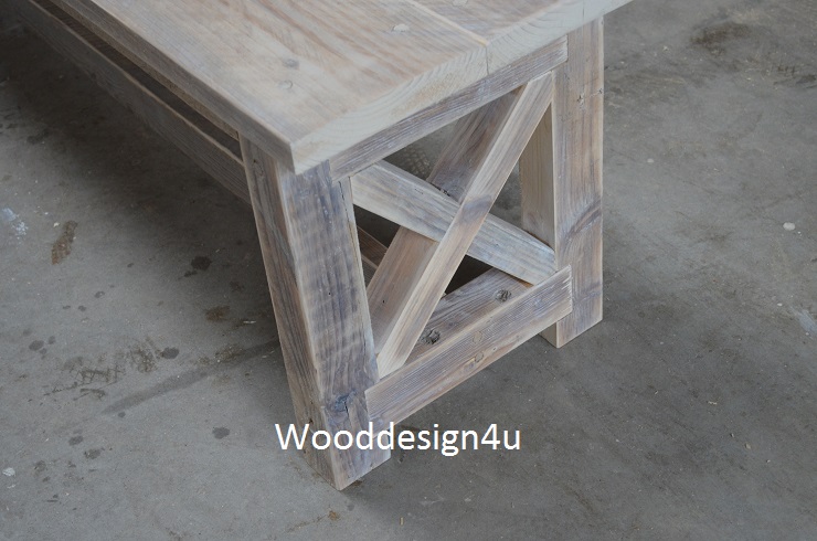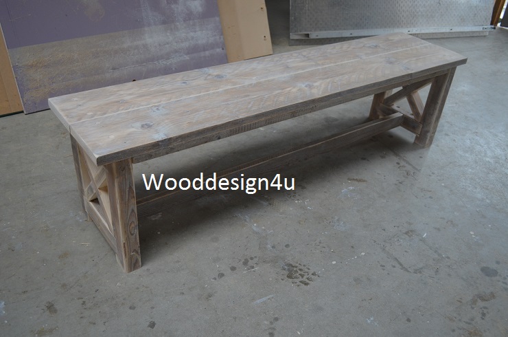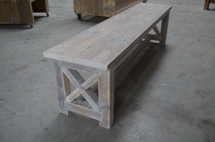 Mooie sloophouten kloosterbank met gekruisde poten in white wash, afmeting 180 x 40 x 45 cm.