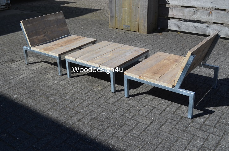 Moderne loungeset 2 stoelen en tafel , verzinkt staal met een houten betimmering.