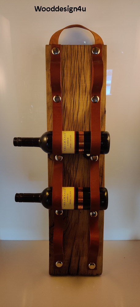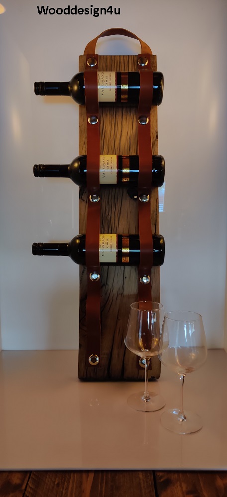 Leuke wijnplank van oud eikenwagondeel in combinatie met een stevig lederen band.
